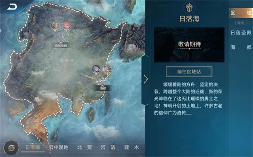 最左边的是日落海,该区域四面环海,多丘陵平原,西部北部群山环绕,东部唯一与云中漠地的王者峡谷接壤土地,却被山脉所阻隔,形成了一条天然屏障,正所谓的蜀道难难于上青天,在这里也可以非常贴切,拥有这条屏障,让日落海大陆宛如世外桃源,这使得日落海不得不开启航海的路后续介绍英雄的时候再来介绍。日落海有两座重要城市分别是日落神殿,海都,在这里有许多的古老的信仰。