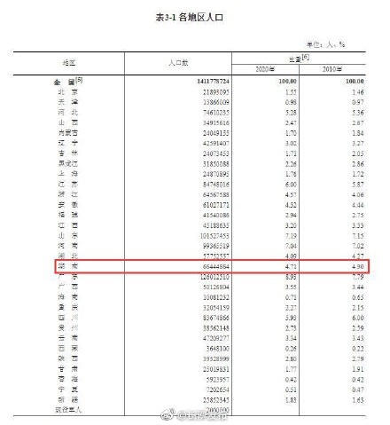 【国家统计局:湖南人口数量为6644万人】国家统计局:31个省份中,人口超过1亿人的省份有2个,在5000万人至1亿人之间的省份有9个,在1000万人至5000万人之间的省份有17个,少于1000万人的省份有3个。其中,人口居前五位的省份合计人口占全国人口比重为35.09%。分区域看,东部地区人口为563717119人,占39.93%;中部地区人口为364694362人,占25.83%;西部地区人口为382852295人,占27.12%;东北地区人口为98514948人,占6.98%。其中,湖南常住人口为66444864人。