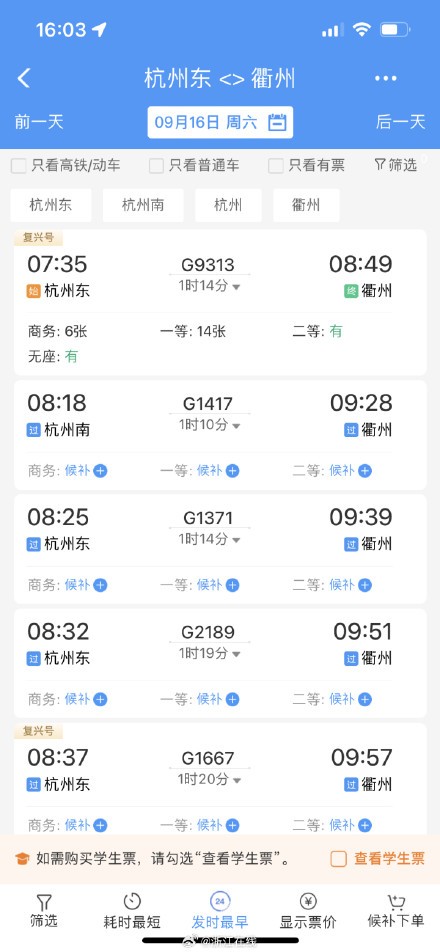 按照亚运服务保障计划,复兴号亚运智能动车组列车9月16日起,在杭州东至衢州以及杭州东至平阳两个区段运行。 车次分别为G9313/G9314次(杭州东至衢州)、G9315/G9316次(杭州东至衢州)、G9311/G9430次(杭州东至平阳),可通达杭州、诸暨、义乌、金华、龙游、衢州、武义、永康、缙云、丽水、青田、温州、瑞安、平阳等地,目前车票已开售。