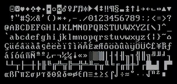 初代IBMPC使用的字符集仅有256个包含字母、数字和符号的字符,以9×14像素点阵的形式存储在4KB内存的单色显卡中,既不能调整字体大小和颜色,也无法显示字符集之外的内容。
