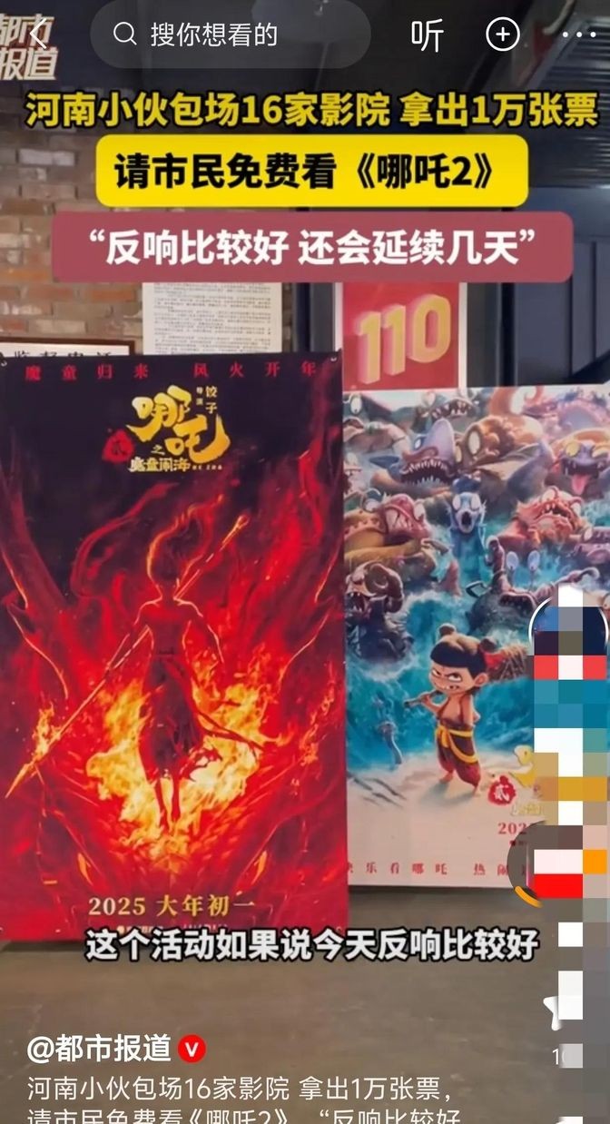 那天,他一拍脑袋,决定包下郑州16家影院,请全城人免费看96场《哪吒之魔童闹海》,也就是《哪吒2》!这消息一传开,大家都懵圈了,心里估计都在想:“这小伙是中彩票了,还是在说梦话呢?”毕竟,包下这么多影院,那得花多少钱呀!这可不是一笔小数目,换成一般人,想都不敢想。