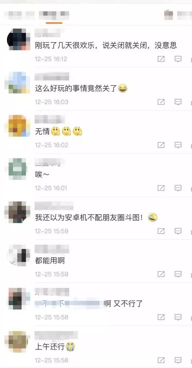 12月25日,有网友称刚刚开放的微信朋友圈表情评论功能似乎被取消了。对此,微信方面证实了这一消息。