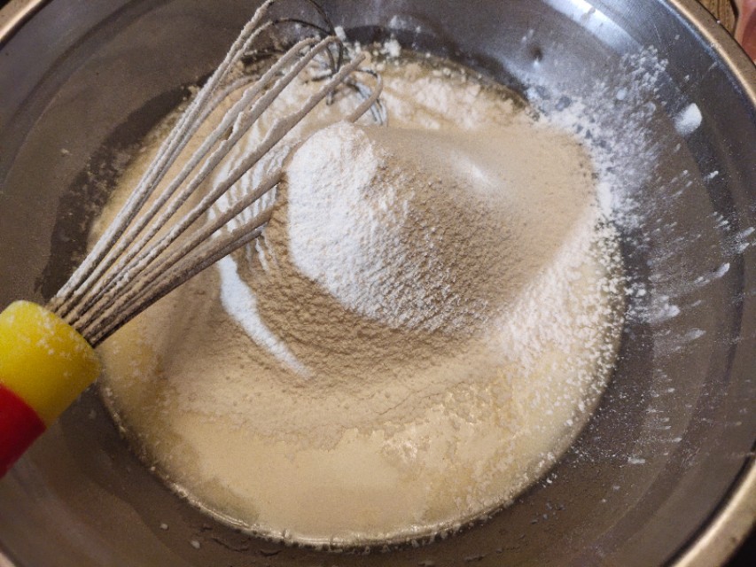 再放入奶粉和低筋面粉,面粉一定要提前过筛一下,这样面糊更容易搅拌均匀,做好的松饼口感也会更加细腻,搅拌面粉无干粉就好了。