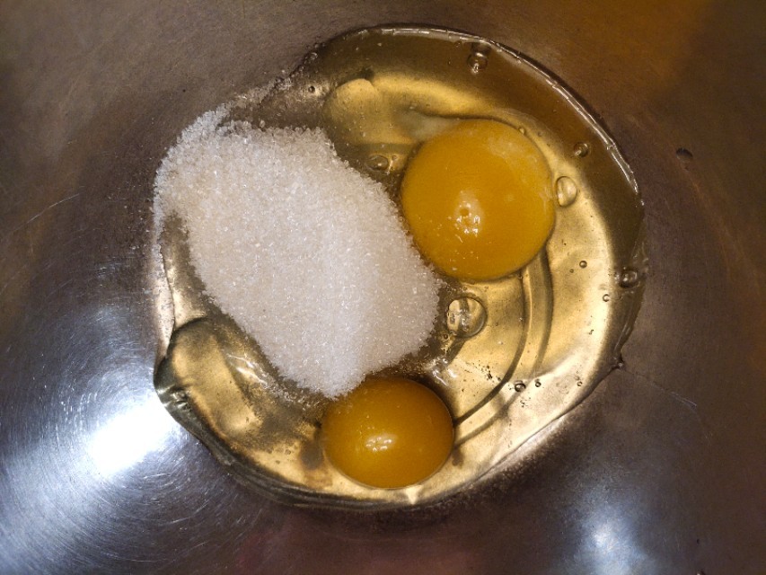 准备一个盆,将2个鸡蛋和白糖全部放进去,滴几滴白醋或者柠檬汁,我其实忘记放了,用电动打蛋器开始打发,全蛋打发会时间比较长。