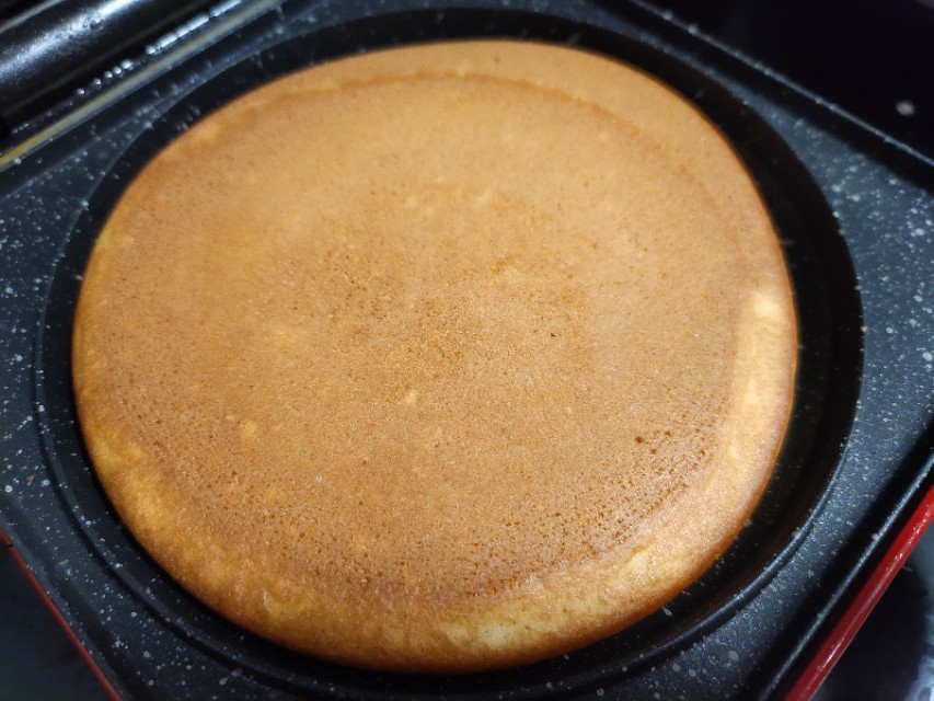 盖上盖子,时间3分钟打开,看到松饼表面出现很多气泡,底部已经呈现焦糖色,翻面再煎至1-2分钟就可以取出装盘。