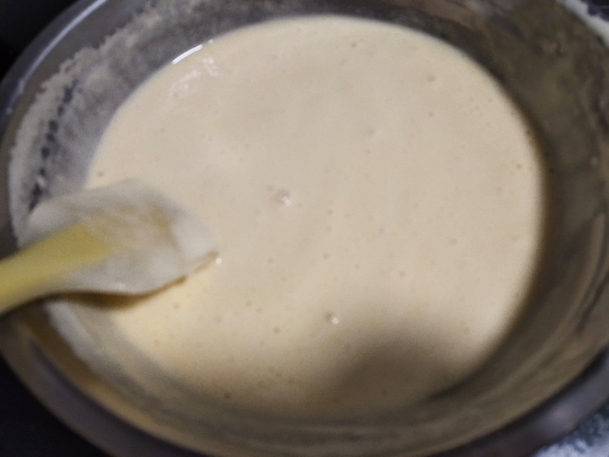 将面糊和打发好的蛋液混合,用翻拌的手法将松饼糊拌的均匀,也就是不要画圈搅拌,像炒菜一样,用刮刀从底部往上翻,以免消泡。