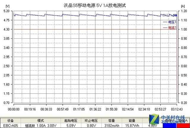 在5V 1A的放电模式下,实测结果沃品S5实际输出容量为3182mAh,输出能量15.87Wh,过程平均电压4.99V,经过计算我们可以得出其实际转化率为85.83%,可用容量比为63.64%,电量从100到0总耗时3小时13分钟。