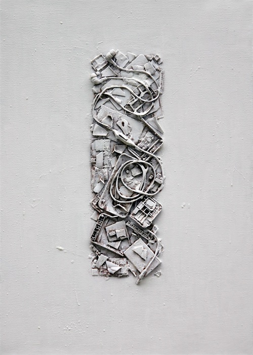 2013年的冬天,张淼狠狠地摔碎了一个手机,他把它贴在了画布上。隔了十三年的综合材料创作重新开始。重新拾起画笔的张淼更沉稳了,他对事物的思考也更成熟了。新的创作历程是从手机开始的,而且一直在延续。为什么用手机作为主要材料?张淼这样认为,手机发明至今,改变了人类的生活与思维方式。有的人认为它对人类文明的发展功不可没,有的人觉得手机让人们疏于直面沟通,从而被信息与科技绑架,直至失去了人之本性。无论手机是好是坏,它已经广泛出现在了这个世界上,这是不争的事实,谁也不能改变。那就打碎它!你会看到塑料、金属、螺丝、线路板……。如果你对手机有人文思考,那就面对这些材料进行进一步的探究吧。它们的“残肢断臂”要么洋洋得意,要么面无表情,要么冷静深邃地正反观着你。