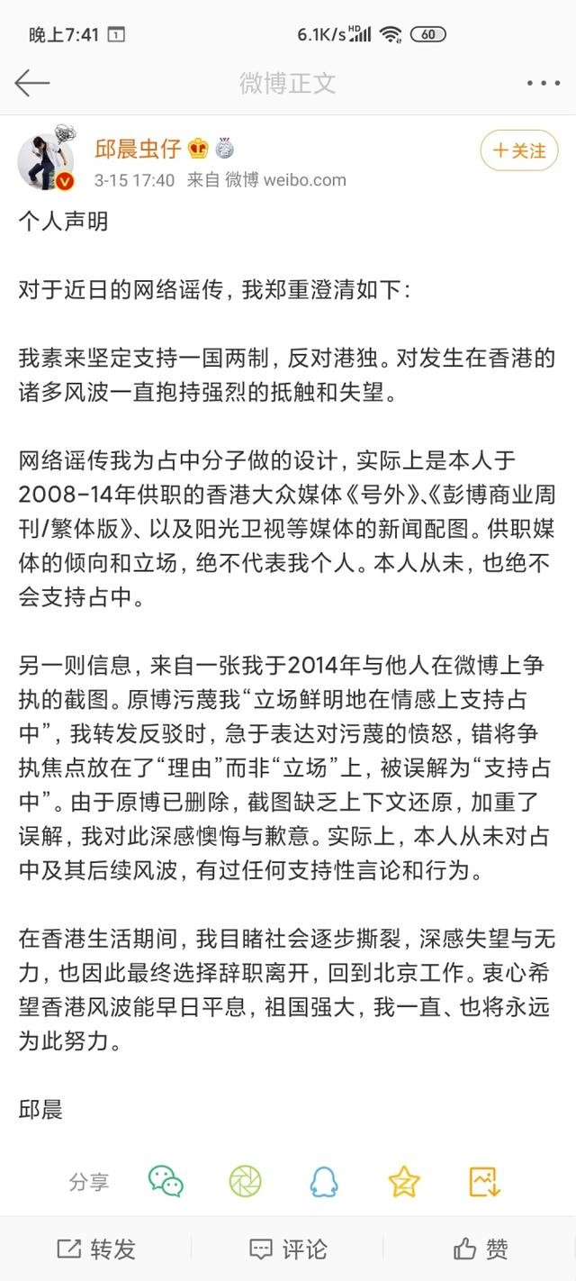 对此,邱晨在网络发布声明进行否认,并表明自己的态度。对于当年发文的事情进行解释,称仅是供职媒体的倾向和立场,绝不代表个人。