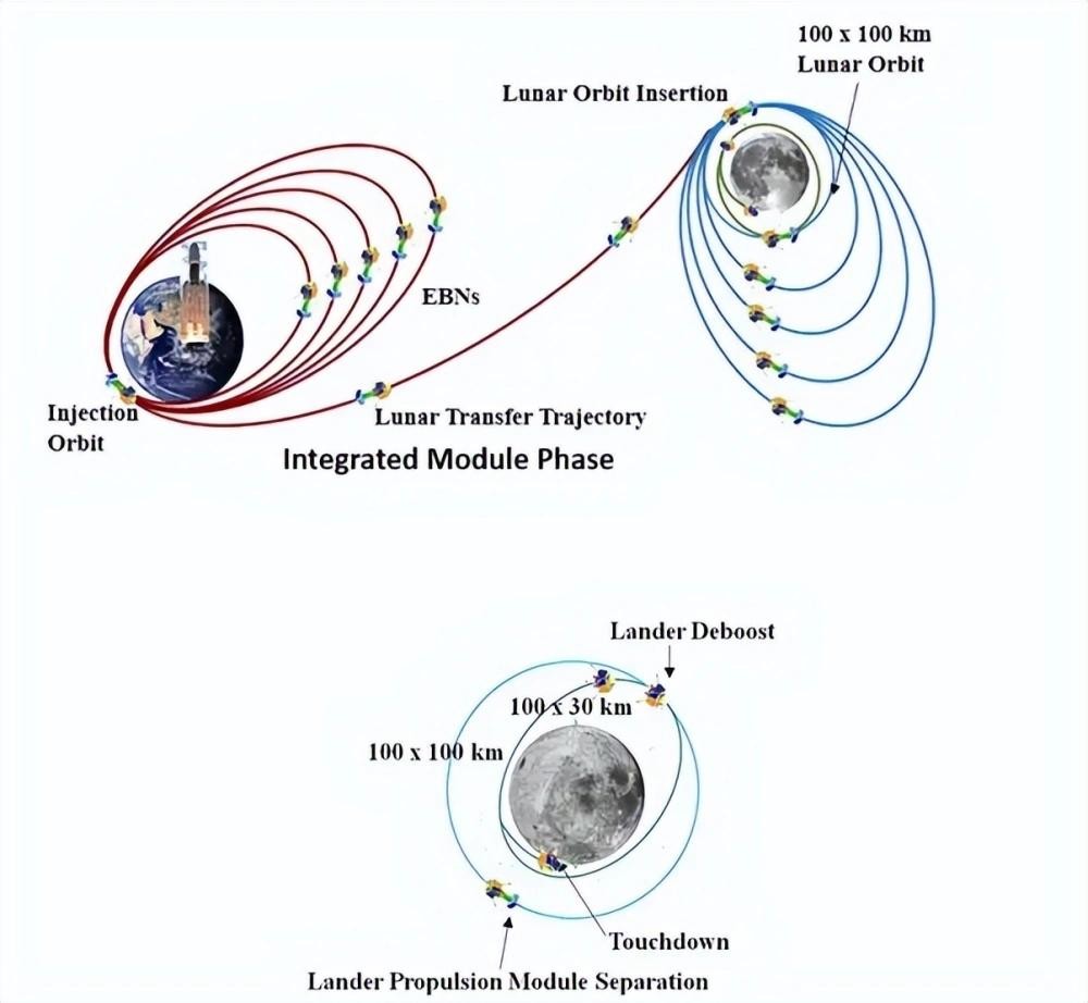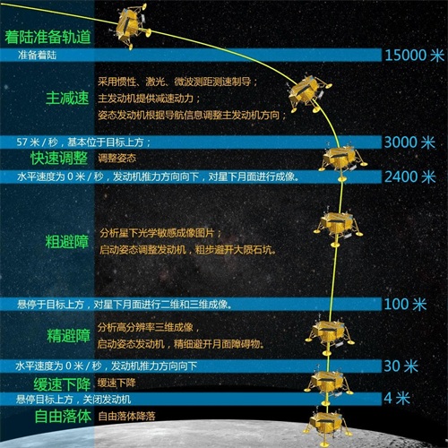 在飞抵到月球后,推进舱又要实施5次近月制动,使月船三号进入100千米的近圆环月轨道,然后着陆器与推进舱分离,着陆器实施自主变轨,将近月点高度降低至30km,进入100×30km的着陆准备轨道。