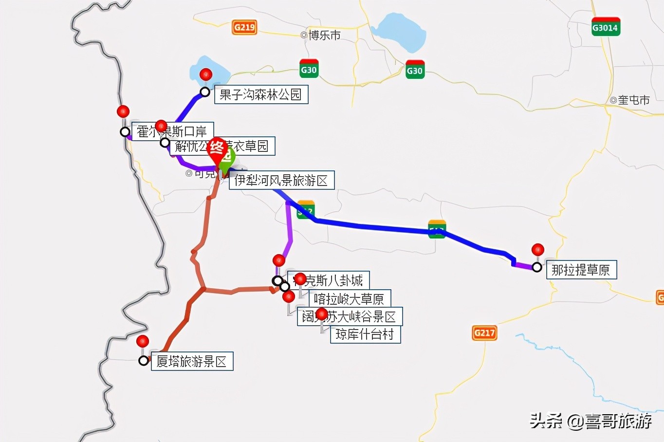 2、伊犁十大景点自驾游行程路线:伊犁-那拉提草原-特克斯八卦城-喀拉峻大草原-阔克苏大峡谷-琼库什台村-夏塔旅游景区-伊犁河风景旅游区-果子沟森林公园-霍尔果斯口岸-解忧公主薰衣草园-伊犁。