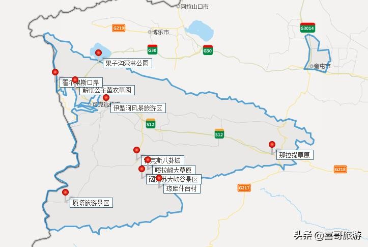1、伊犁十大景点依次为:那拉提草原、喀拉峻大草原、解忧公主薰衣草园、霍尔果斯口岸、夏塔旅游景区、果子沟森林公园、琼库什台村、阔克苏大峡谷、伊犁河风景旅游区、特克斯八卦城等。具体位置如图所示。