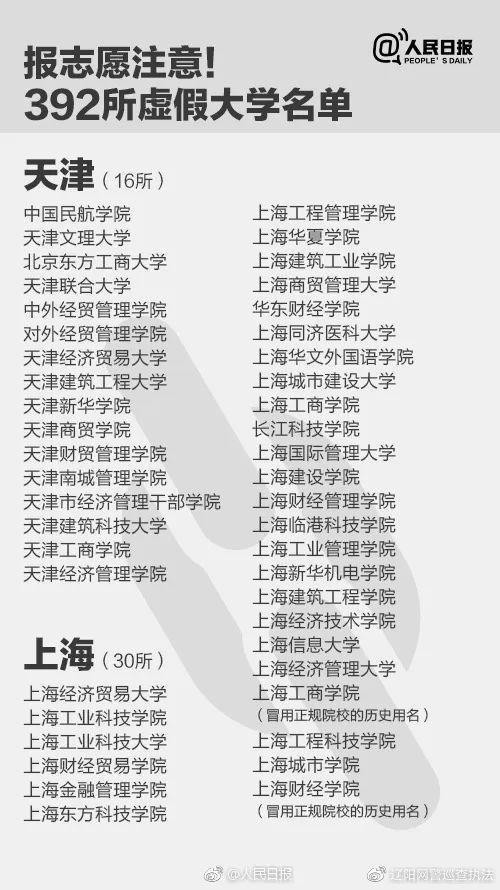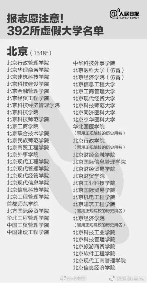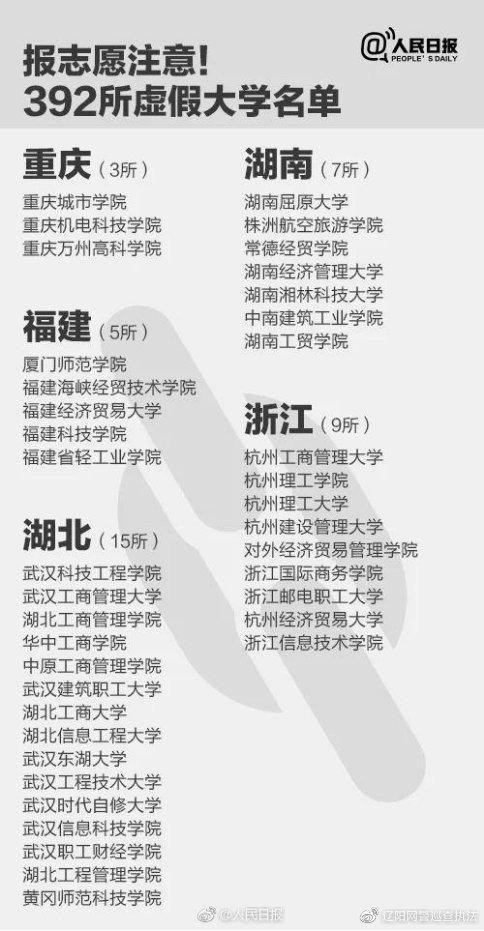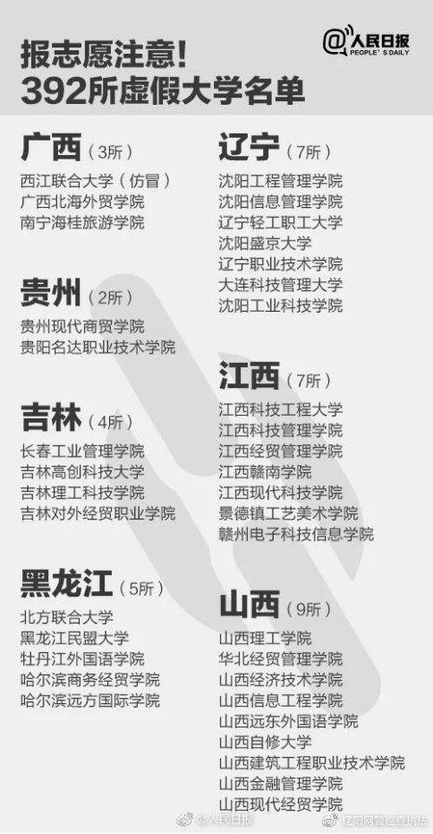 最后附上由人民日报曝光出来的全国392所”野鸡大学“,家长们在选择时要注意规避这部分的所谓”大学“即可,这些大学有的可能是连个上课校区都没有的”学校“。不过要注意哈,名单上是有一处错误的,广东省的广州理工学院是正儿八经的国家统招本科学校,是由原广东技术师范大学天河学院转设而来的。