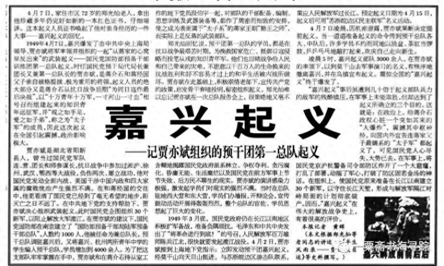 1949年4月7日,嘉兴爆发了由中共中央上海局领导、贾亦斌将军率领并组织的一起“从蒋家的心窝里反出来”的武装起义——国民党国防部预备干部训练团第一总队起义。