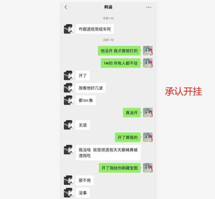并将对局视频提交给官方核实。最后好友承认隐瞒寂然开了透视,因为连胜号撞到了韩涵不想输,寂然得知此事后立刻对韩涵及TUT成员道歉,快挂的玩家也对TUT道歉,态度十分诚恳。