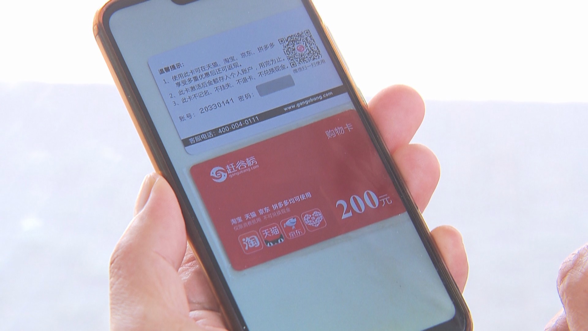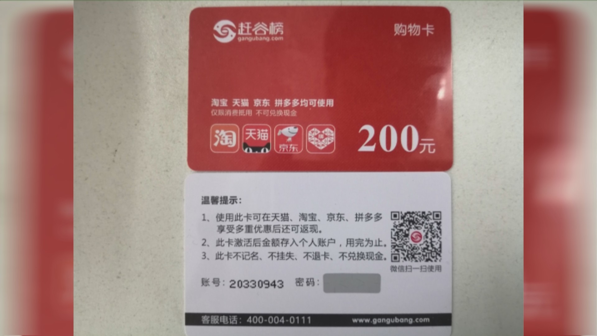 徐先生捡到的这两张购物卡,名为“赶谷榜”。外观来看,这种卡和普通购物卡没有什么区别,一面印有天猫、淘宝、京东、拼多多均可使用,面值200元,仅限消费抵用;另一面有二维码、客服电话、网站以及账号和密码等信息。