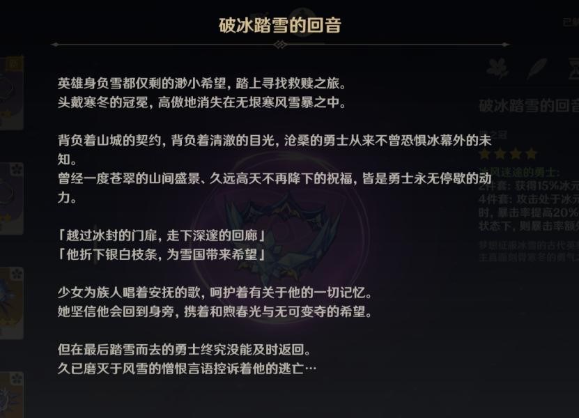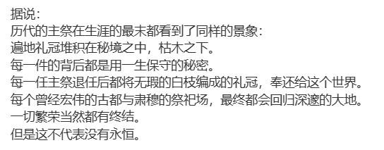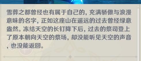 祭司登上了原本朝向天空的祭场,却没能听见天空的声音,也没能返回。直到古国彻底的覆灭,勇士都没能归来,勇士永不停歇的动力,再次回归山中古国的勇士,迎接他的只有报死的回音,失去最后守护之物的勇士,留下了斩碎风雪的星银大剑,就此下山而去,只留下雪山的记录者乌库。