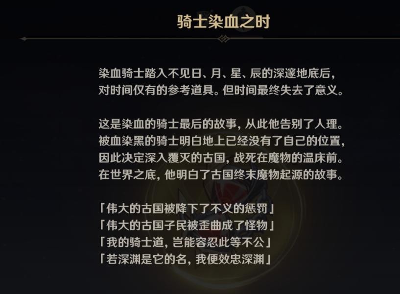 ⌈距今约500年前⌋统治坎瑞亚王国的黑日王朝覆灭,伟大的古国被降下了不义的惩罚,伟大的古国子民被歪曲成了怪物,我的骑士道岂能容忍此等不公,若深渊是它的名,我便效忠于深渊。引发席卷大陆的灾难,深渊教团和丘丘人出现于灾祸之中。