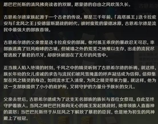 筑起高墙、用烈风切割风雪的“高塔孤王”迭卡拉庇安,与“北风之王”安德留斯为了争夺风之神的神位展开厮杀。琴的祖先族长古恩希尔德为了躲避战乱,带领族人出逃,蒙德尚是被风雪冻结的大地,在绝境之时族长女儿和子民的祈祷结成信仰,风之精灵巴巴托斯回应了他们的呼唤。为他们构筑一座小小的庇护所,并为组长的女儿施加精灵的眷顾。