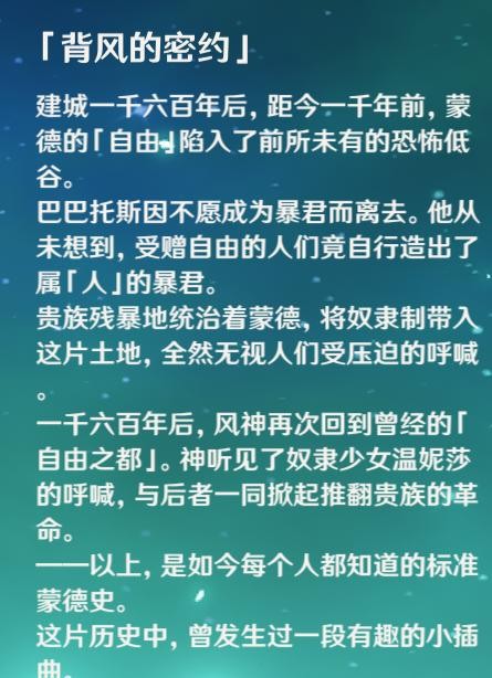 ⌈距今约2600年前⌋蒙德旧城人民为了追求自由,自发组织起来队伍与组织与高塔的君王展开了抗争(自由,抗争,诗文,蒙德的三大精神也是天赋突破素材)。这时一位少年在风之精灵巴巴托斯(温迪)配合下带领人民反抗高塔孤王,高塔孤王战败,但直到最后,孤王都以为众臣爱他,一如他爱他们。