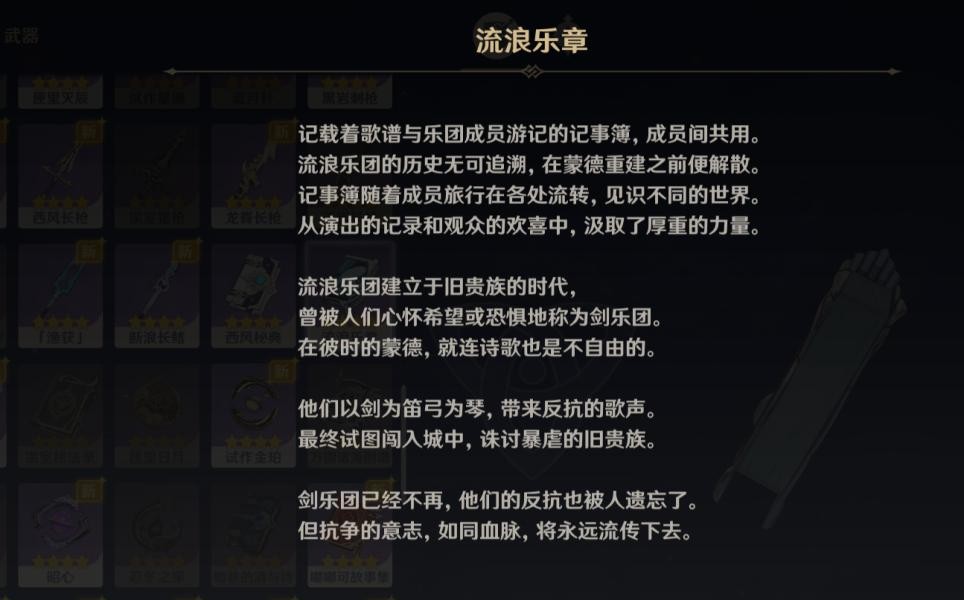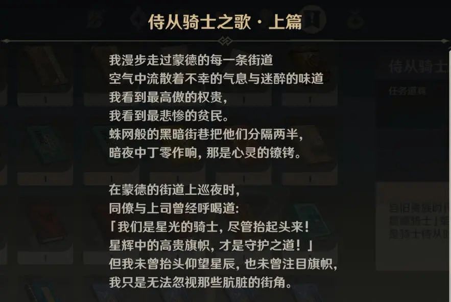 现蒙德书库原本是原贵族的浴场,记录莱艮芬德最后放弃了助纣为虐的骑士身份。流浪乐团反抗失败后,遭到清洗。后遗志继承者建立地下组织。旧贵族仍然统治着蒙德城。