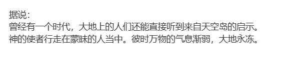 ⌈距今约???年前⌋当古国拥有了超越原本预期的繁华,人们开始向天空发起了疑问,尘世的生灵表达了对天空的向往。高天上的什么无法忍受这种挑衅,降下不详之昭,对所有敢于挑战神明的凡人施加神罚。