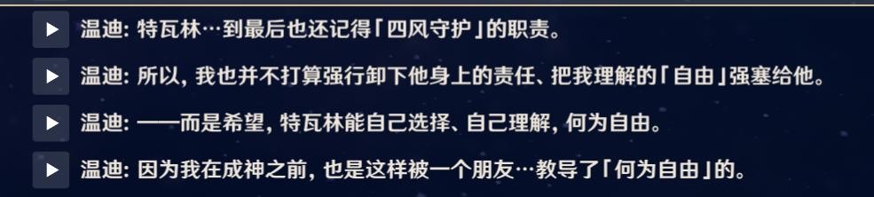 最后巴巴托斯和旅行者解决了特瓦林的危机。但在最后巴巴托斯并没有强迫特瓦林继续履行东方之龙的责任,而是给予其自由,让他自己来选择未来的道路,风之神并不需要附属的眷属,生活于蒙德中的一切生物都应该享有她所本应拥有的自由,自由的蒙德更应该拥有自由的子民,这也是蒙德所存在的意义与历史。