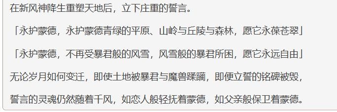 而蒙德的人民便在北部的一座大湖的湖心岛上建立了城镇,用大桥连接了陆地和岛屿,而那座湖便是果酒湖,是后世蒙德人们酿酒所用的水源之一。劳伦斯家族的主母樊尼拉睿带领蒙德人在广场上修建了一座高大的神像,神像下的铭文则是蒙德贵族们共同立下的誓言:永护蒙德,永护蒙德青绿的平原、山岭与丘陵与森林,愿它永葆苍翠永护蒙德,不再受暴君般的风雪,风雪般的暴君所困,愿它永远自由