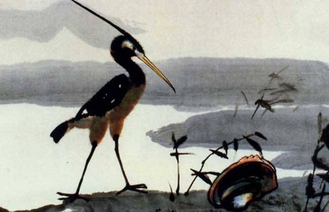 鹬蚌相争故事很简单,可是水墨画的感觉很漂亮。