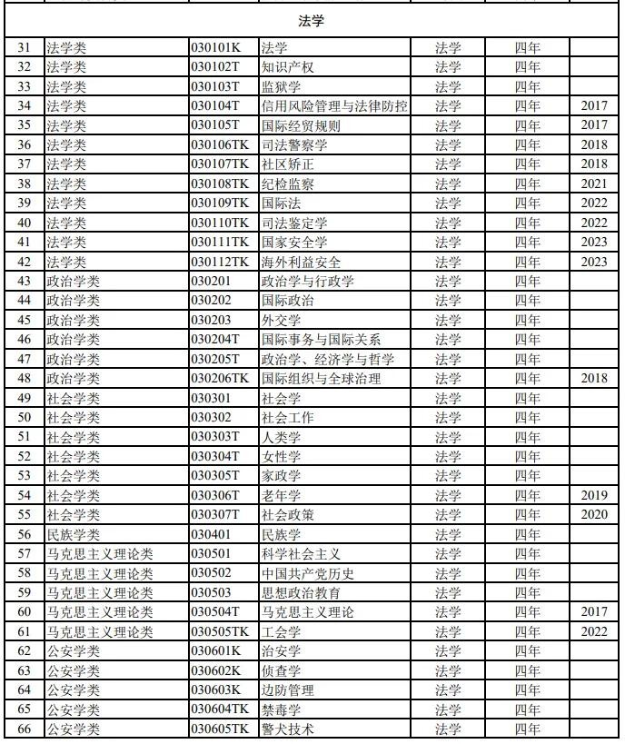 法学门类下有法学、政治学、社会学、民族学、马克思主义理论、公安学等几类。