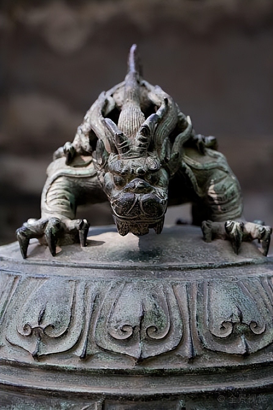 形似盘曲的龙,平生好鸣好吼,洪钟上的龙形兽钮便是它的雕像。蒲牢虽为龙子,却一向害怕鲸鱼。当鲸鱼一发起攻击,它就吓得大声吼叫。人们根据它的特点,把蒲牢铸为钟纽,又将敲钟的木杵作成鲸鱼形状。敲钟时,让鲸鱼攻击蒲牢,使之“响入云霄”。