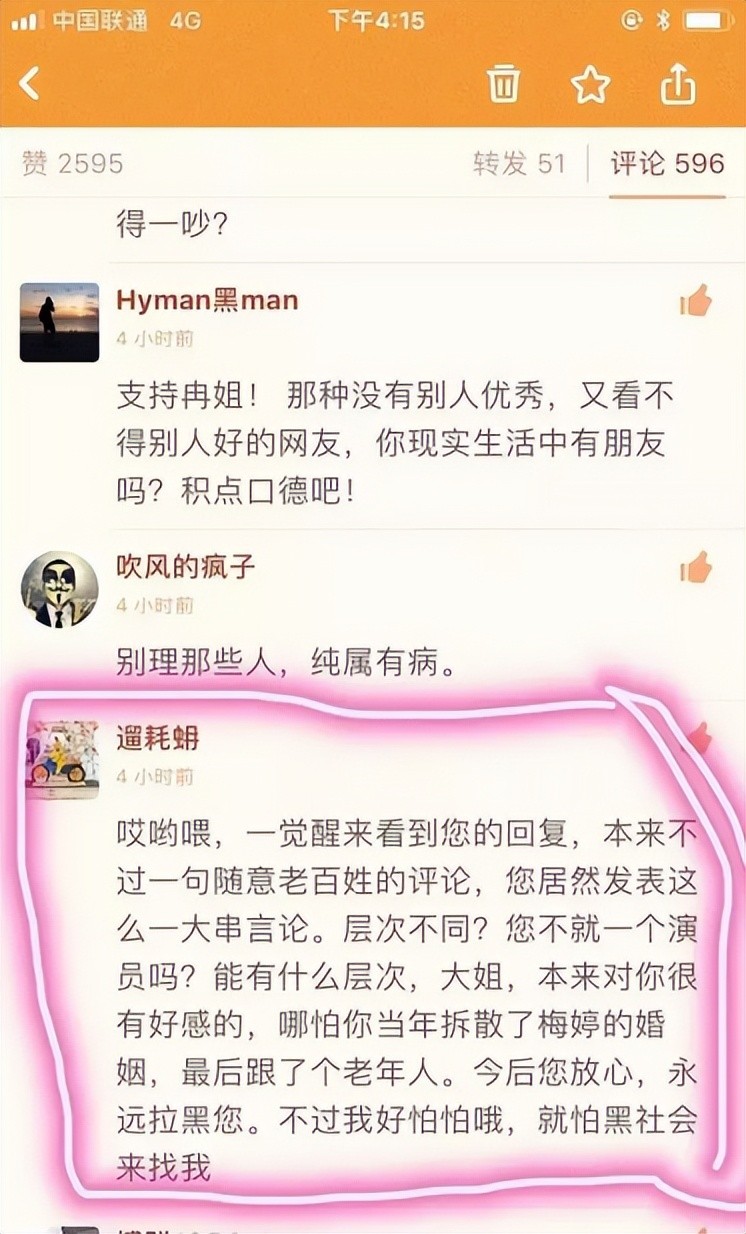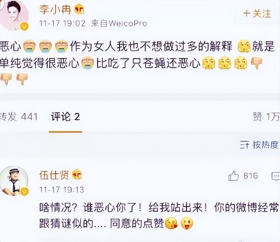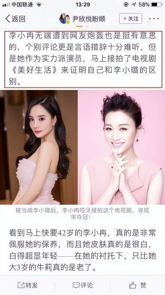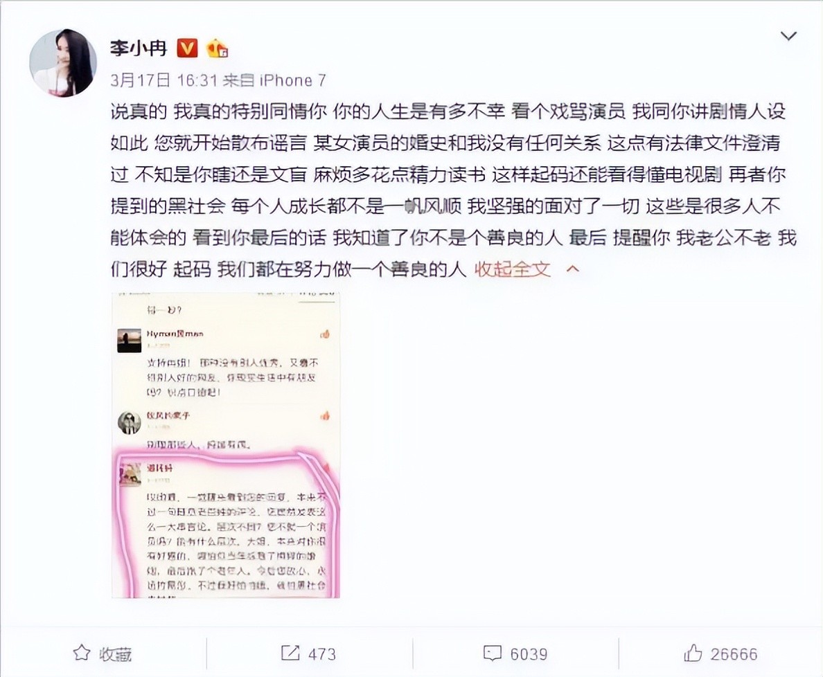 这一言论激怒了李小冉,她直接将这条言论挂出,回怼到“某女演员的婚史和我没有任何关系”“不知是你瞎还是文盲”,并称这位网友不善良。