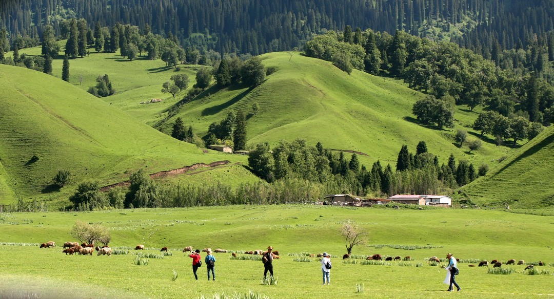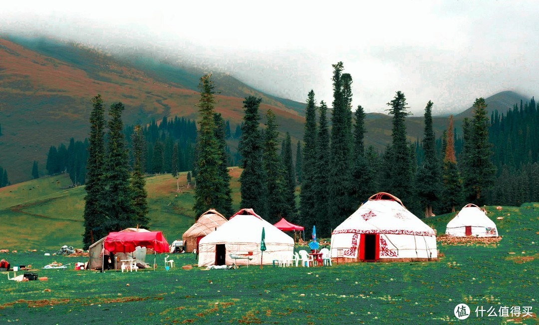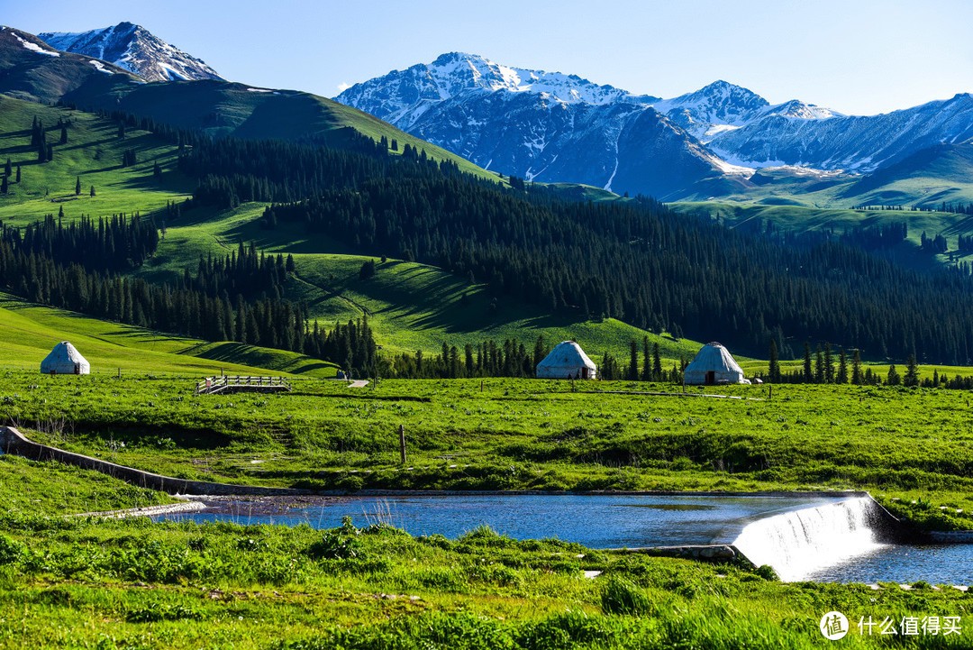 森林,溪流,马儿,羊群,雪山和牧民的房子。在雪山脚下,你能看到大片的雪岭云杉,而夏天,草原上的草儿转为碧绿色,也是来那拉提草原最好的时候。