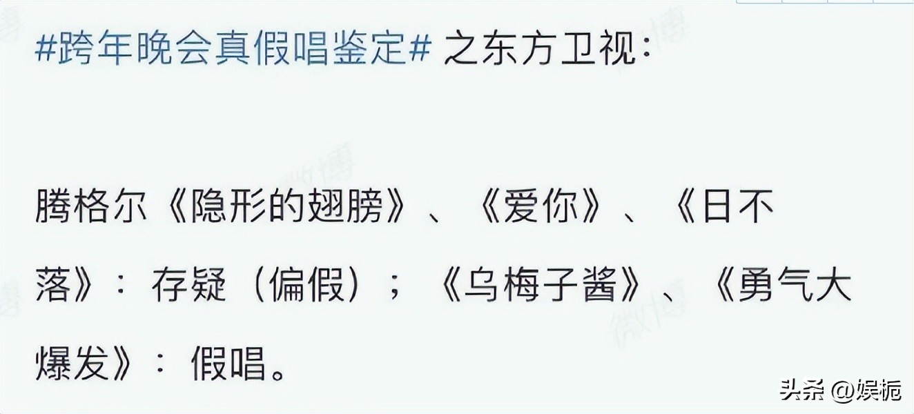而然从跨年结束后,微博上的一位博主,突然发文对各家卫视在跨年中的歌手进行打假,甚至清清楚楚的列举了,自己的每位歌手的判断。