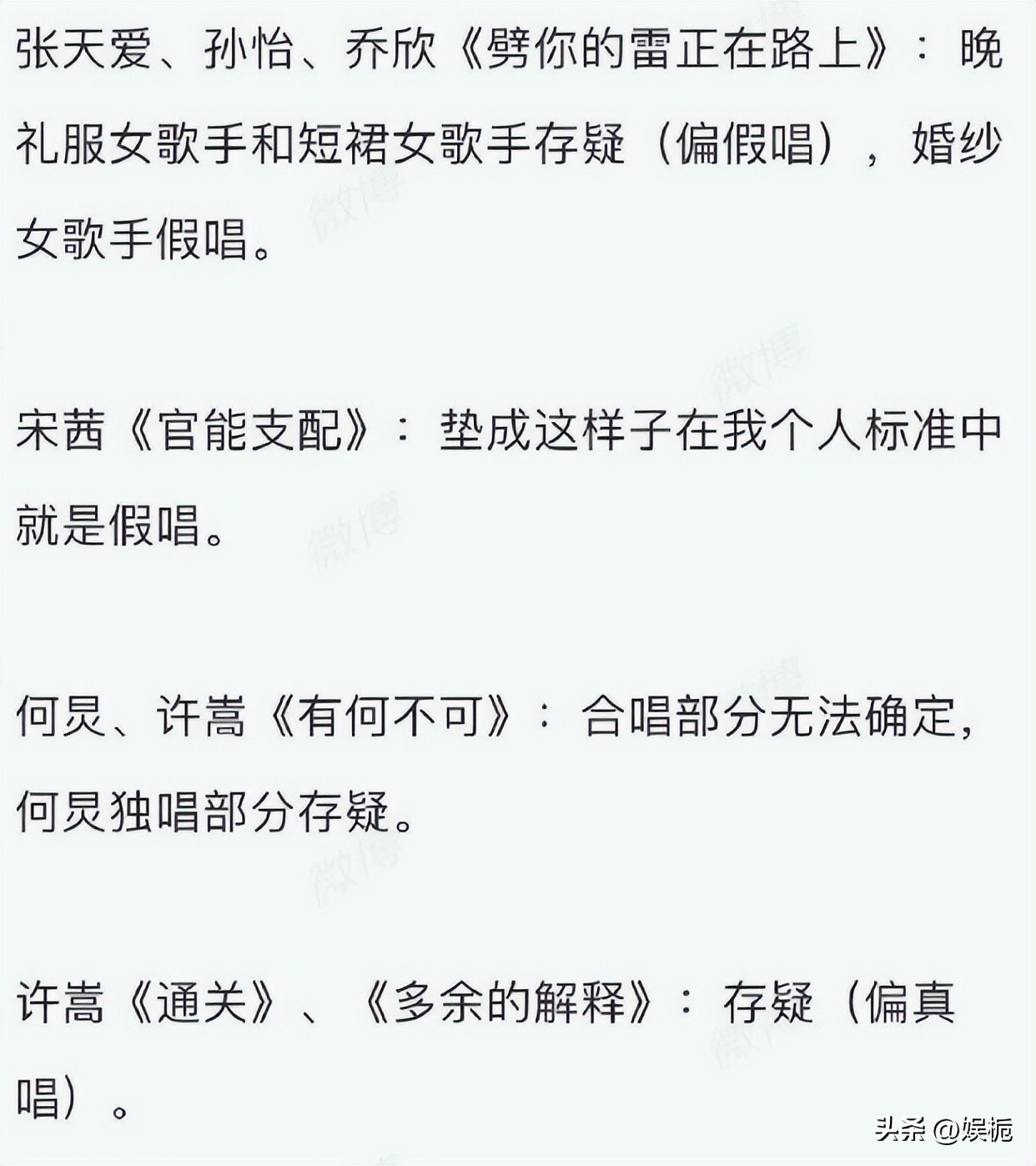 看来这次的“假唱事件”,具体是真是伪未能得出具体结论,毕竟这个名单中还只是“声理学”自己的个人见解。