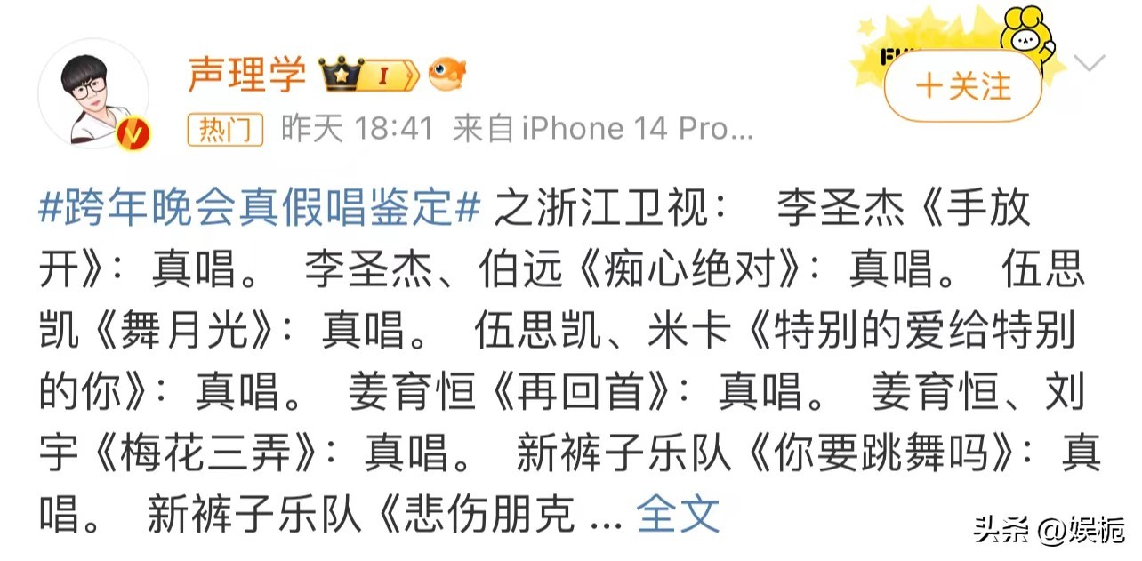 甚至在这名博主的看法中,江苏卫视全员真唱值得点赞,这次“声理学”一共给出了三种结论,分别是真唱、假唱还有存疑。