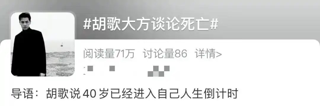 42岁的胡歌大方谈论“死亡”,并直言“进入生命倒计时”。
