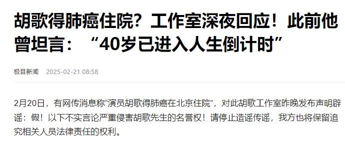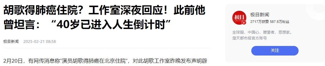 胡歌得肺癌住院?工作室深夜回应!此前他曾坦言:“40岁已进入人生倒计时” 极目新闻
