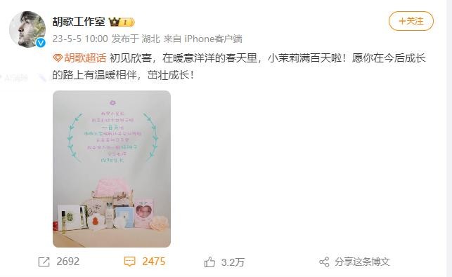 在女儿一百天的时候,胡歌工作室发文庆祝“小茉莉”百天,也第一次公开了胡歌女儿的小名。