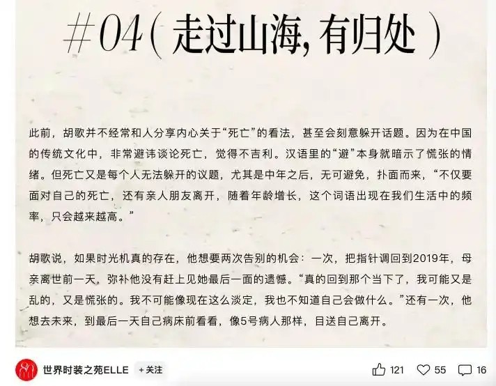 杂志方也没有想到,胡歌居然对死亡这一话题有充分的思考。