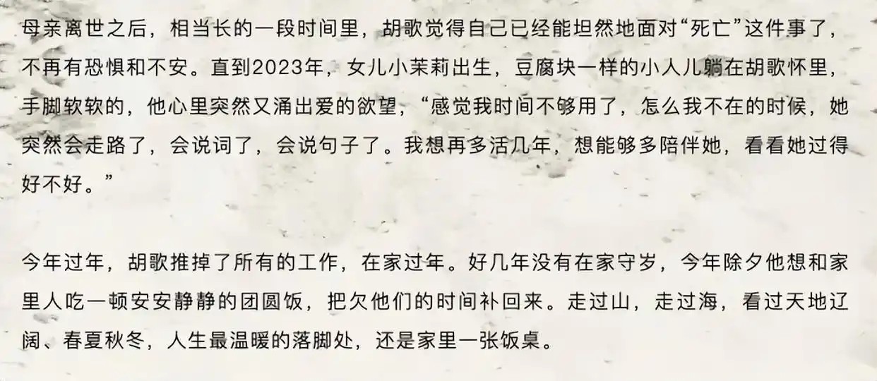 直到2023年,女儿小茉莉的出生,再度让胡歌对死亡感到了不安。