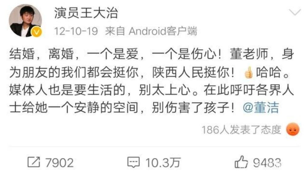 2012年,她发布离婚声明时,王大治也第一时间站出来力挺她。