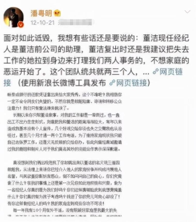 随后,董洁的经纪人以工作室的名义,在网络上盘点潘粤明的“种种罪行”。