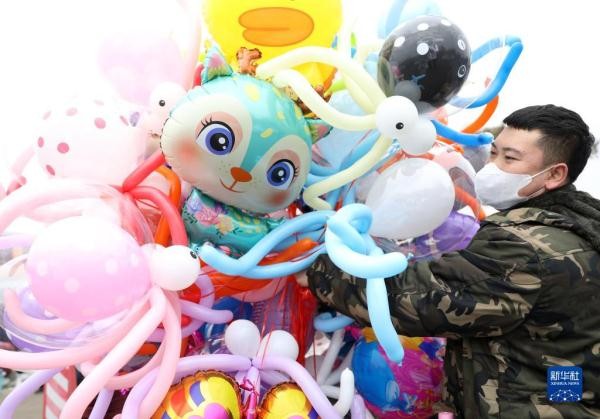 1月12日,一名摊主在蒲河大集上售卖气球。