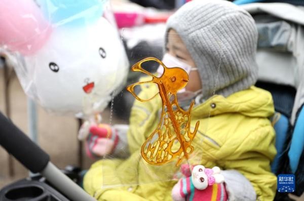 1月12日,一名小朋友拿着兔子图案的糖画和棉花糖。