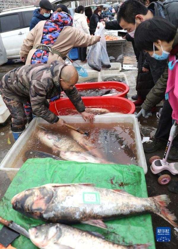1月12日,市民在蒲河大集上买鱼。