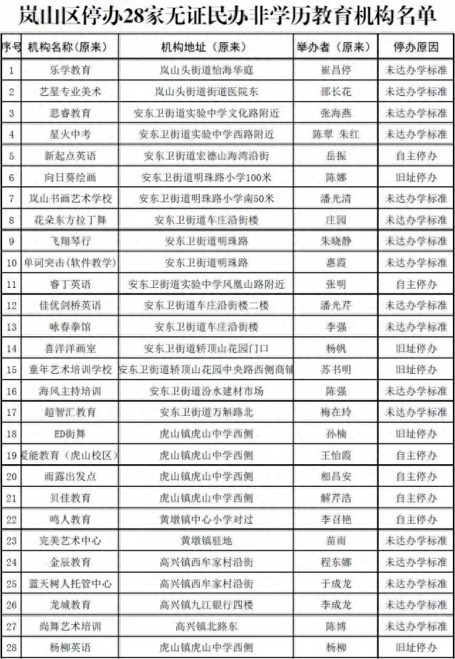 自公告发布之日起,请28家无证民办非学历教育机构立即停止办学,对拒不停办的,由区综合行政执法局和属地政府依法予以关停,并作出行政处罚。