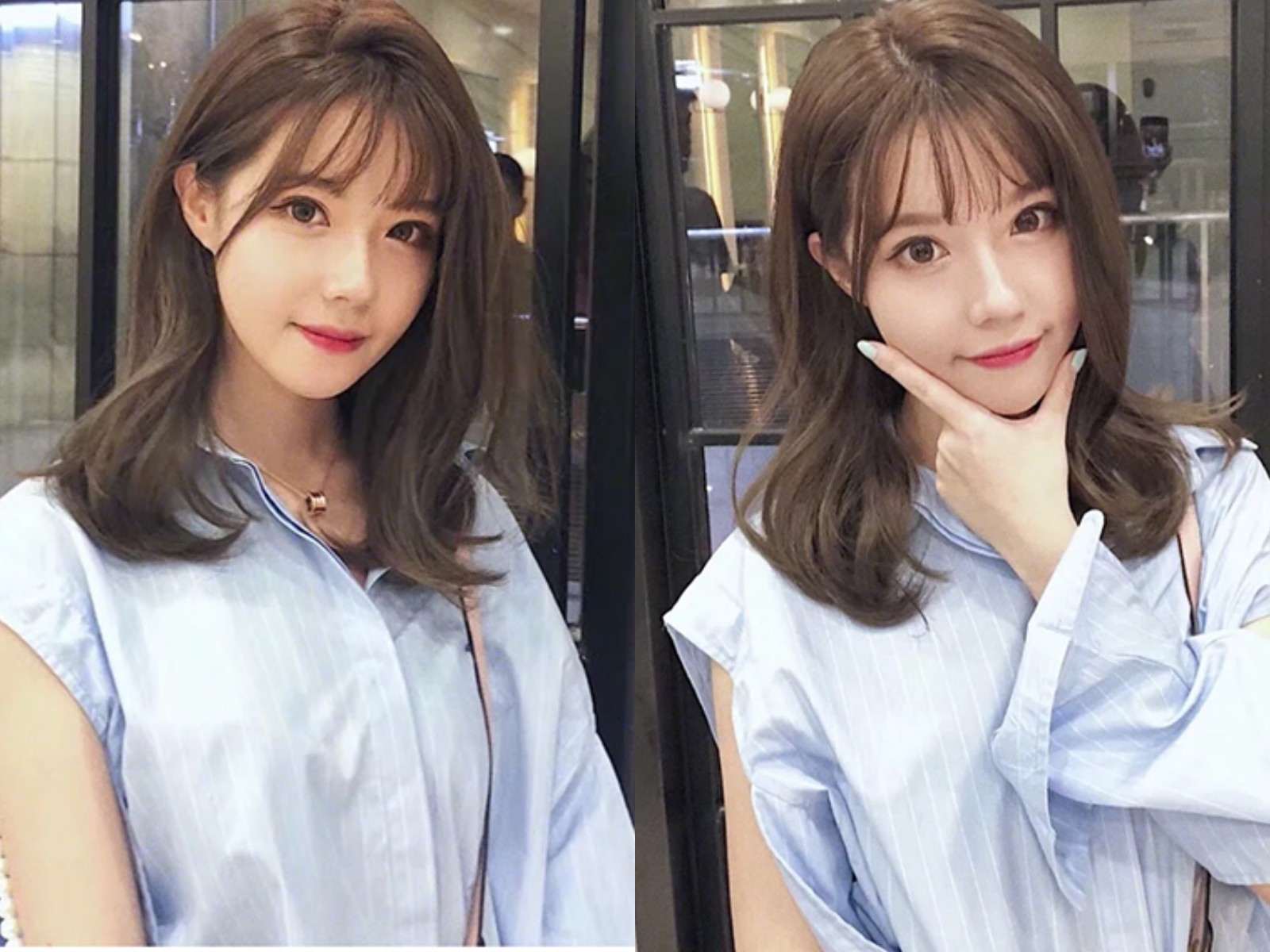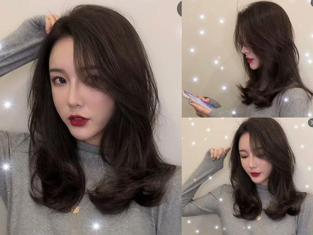2.这款锁骨烫发型,发尾内翘卷度处理,染上亚麻棕色,很适合皮肤白皙的妹子。更显白。蓬松度刚好的空气齐刘海,修颜又减龄时尚。