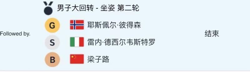 此外,在男子大回转-站姿的比赛中,中国选手梁景怡获得第八名,孙艳龙和陈信军分列第19和25名。