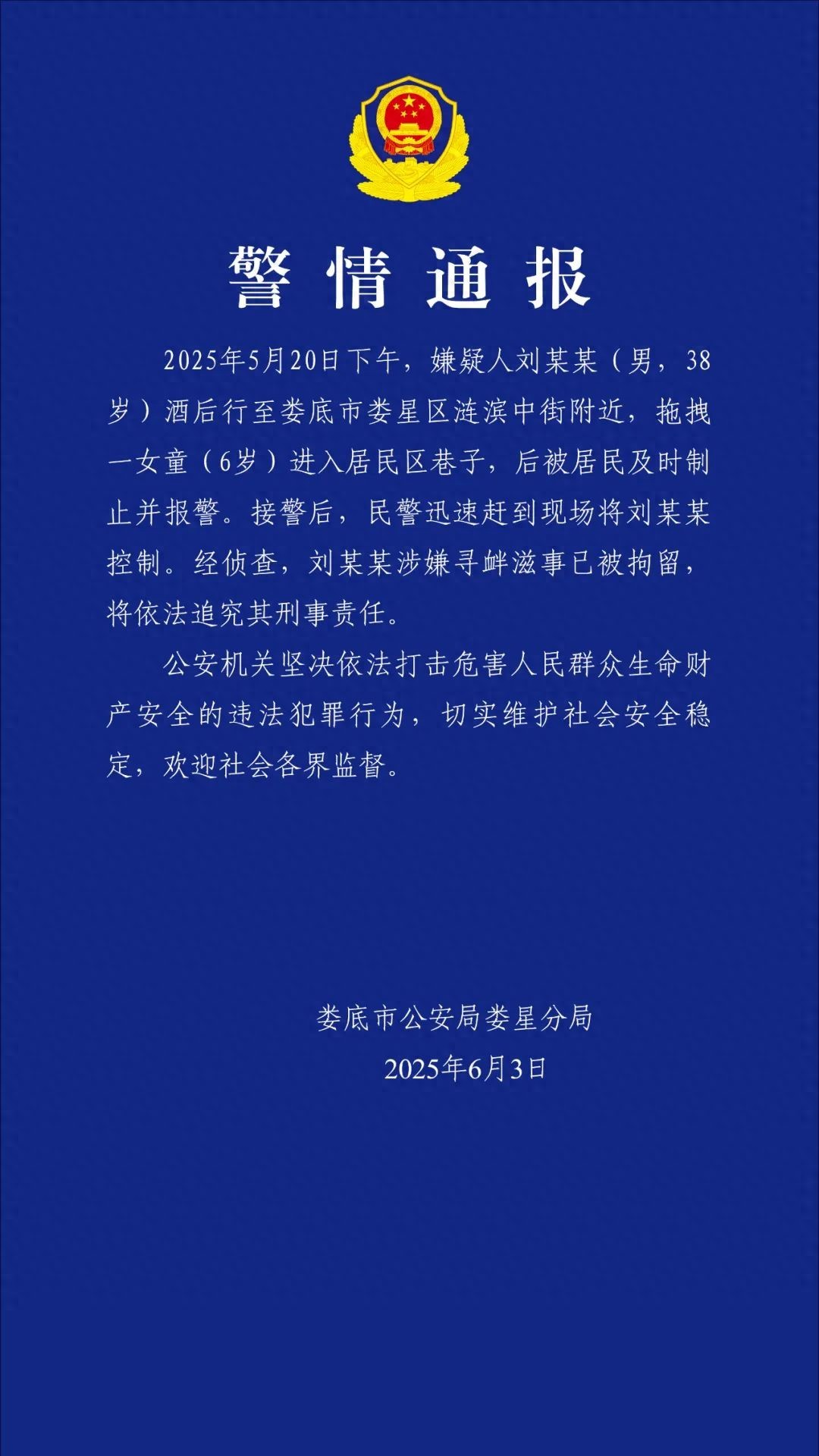 2025年5月20日下午,嫌疑人刘某某(男,38岁)酒后行至娄底市娄星区涟滨中街附近,拖拽一女童(6岁)进入居民区巷子,后被居民及时制止并报警。接警后,民警迅速赶到现场将刘某某控制。经侦查,刘某某涉嫌寻衅滋事已被拘留,将依法追究其刑事责任。